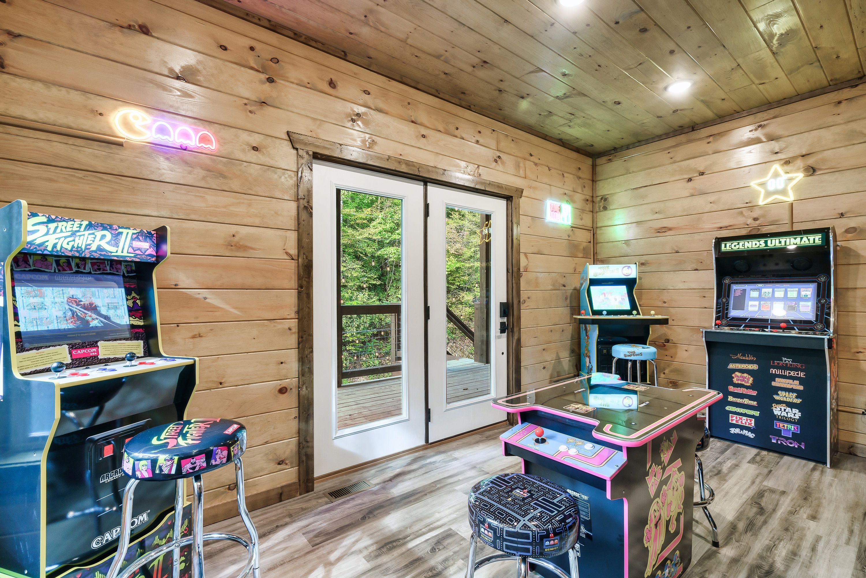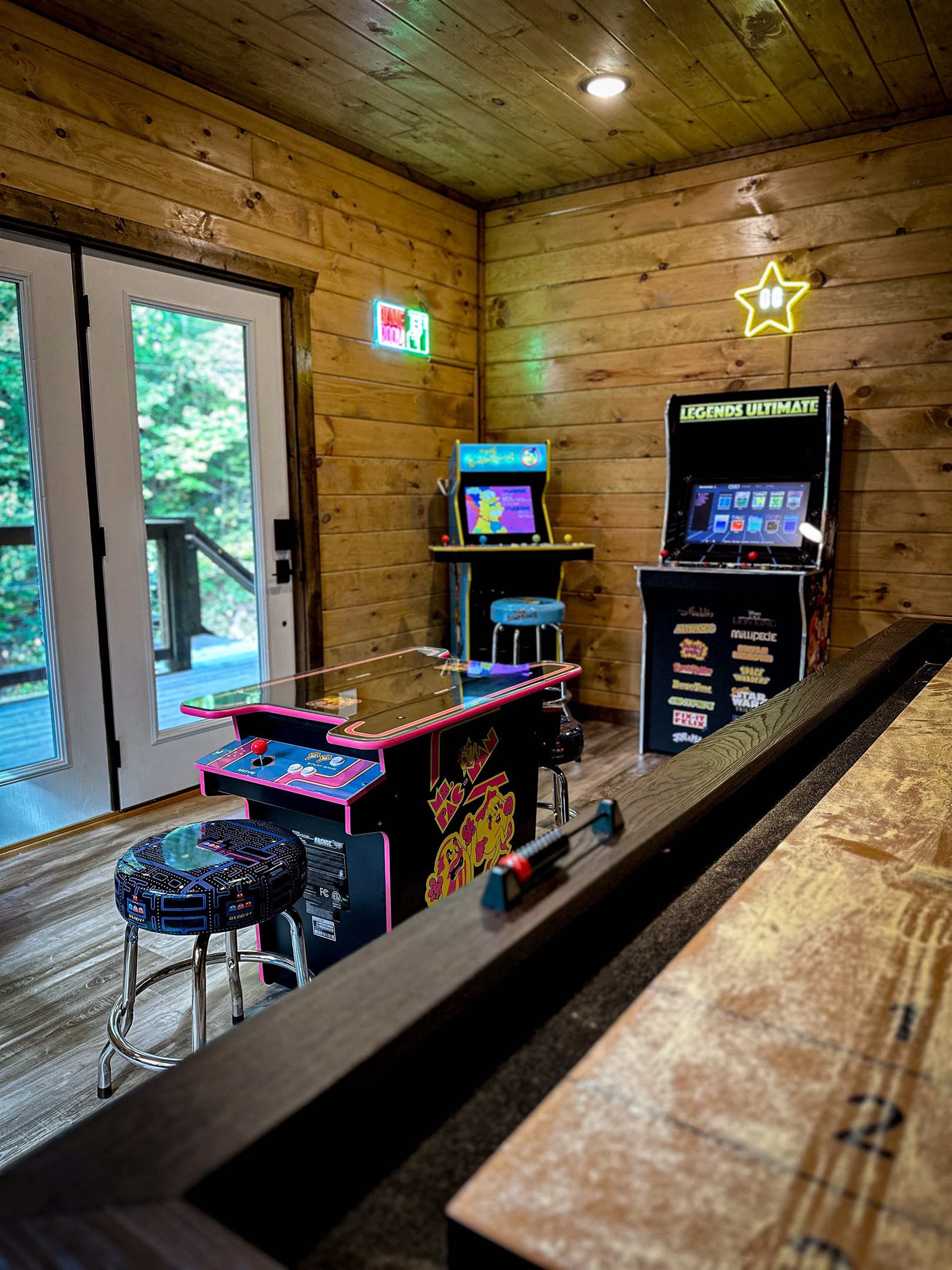 ➡ Game room with four arcade machines, shuffleboard table, 65 inch TV, and various board games